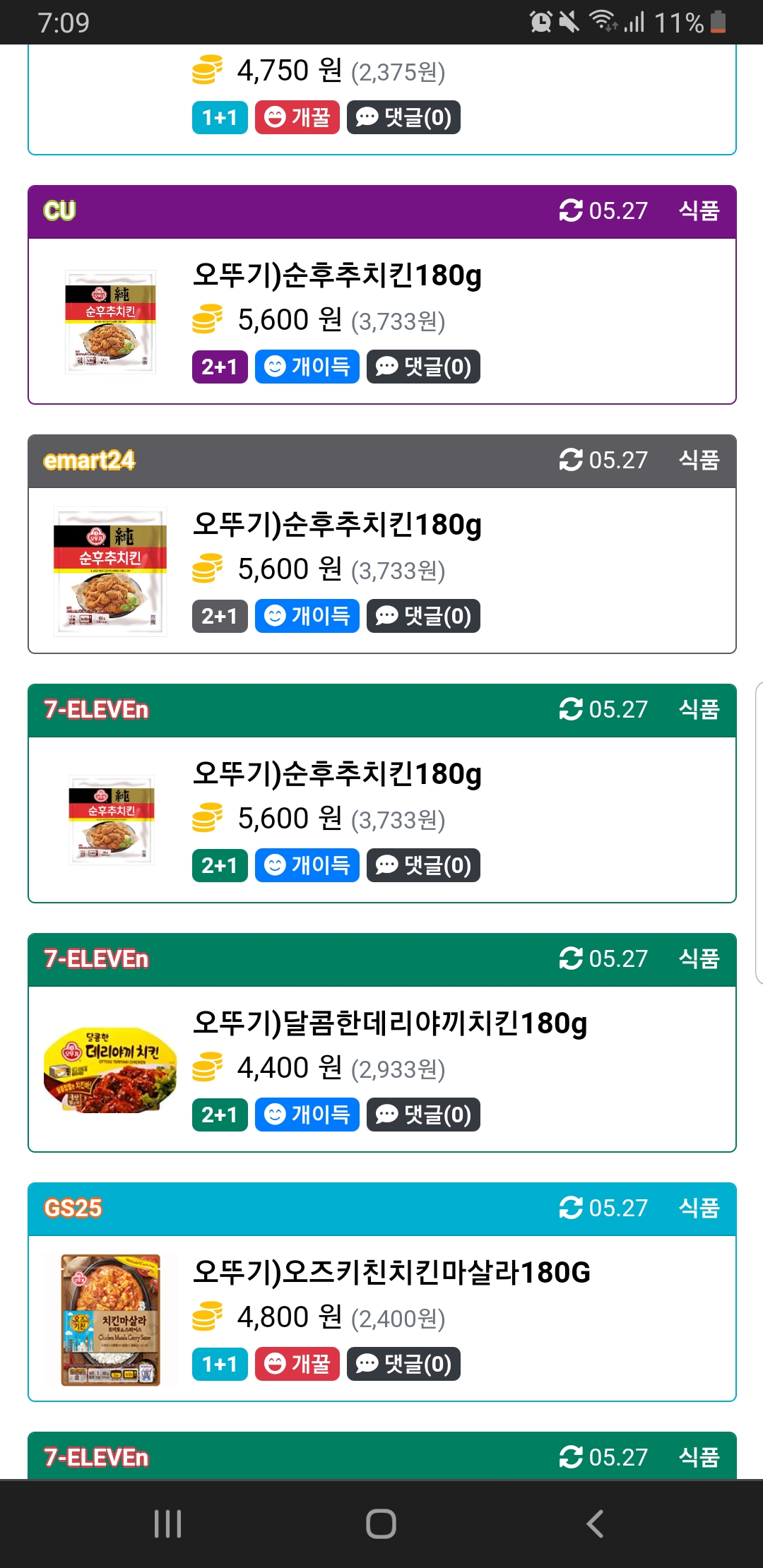 180그램 짜리 편의점치킨을 1+1 특가(봉지당 2600)할때 먹으면 제일 가성비가 좋다.